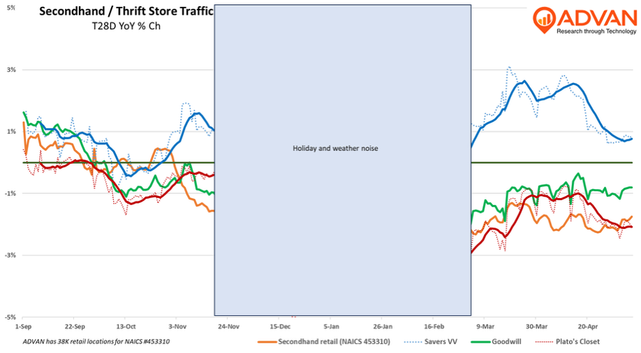Better-than-expected quarterly results from Savers Value Village and ThredUp, plus the threat of inflation from tariffs, motivated us to take a look at foot traffic for the secondhand retail sector and its major players. As a reminder, the fiscal stimulus of ’21 and the bout of inflation in ’22 produced very strong years for the sector. So much so that those good times compelled ThredUp to IPO in ’21 and Savers in ’23. However, in the 2H '23 industry growth meaningfully slowed because: (1) the compounding high inflation hit discretionary spending, and (2) Temu took meaningful share of Halloween customs and decorations and Christmas decorations and furnishings. (Temu’s rise was also very detrimental to crafters and the craft retailers, so much so that JOANN’s business failed.)