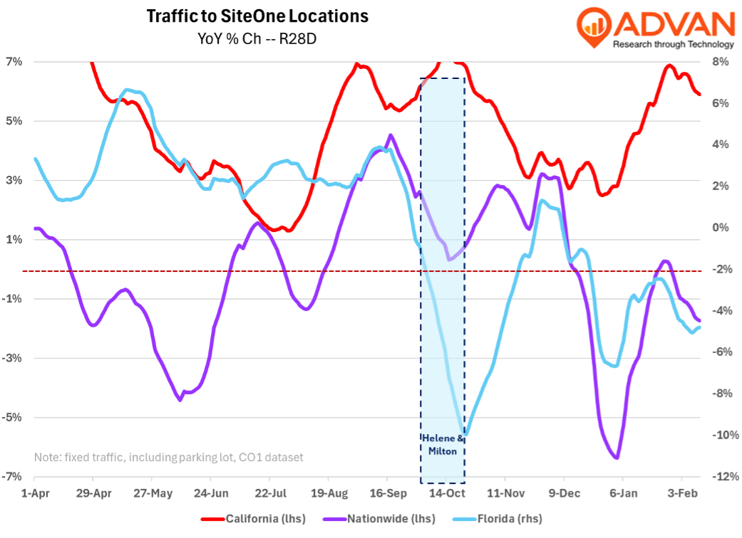 SiteOne’s business and results are interesting these days as they provide a read on the results of immigration policy on industries heavily dependent on immigrants, extreme weather and natural disasters, commodity inflation, and housing. The latter three of these were impactful to SiteOne’s Q4 as one can see in the chart below, obviously especially for Florida. The pick up following the hurricanes was quite abrupt and one would expect those orders to be larger which may be behind SiteOne’s daily volume increase of +4.0%, a 200 bps improvement from Q3’s rate. Deflation is still present for the business and that was a -300 bps headwind to organic daily sales growth. In January, California picked up nicely, which is more likely due to the warm dry weather (vs. wet last year) and not due to any recovery from the fires; that’s on the come as we note below. As to the pace of housing and landscape projects, i.e., the macro, management’s guidance is for only modest growth, and so, no pick up yet.