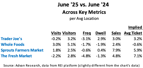 The Fresh Market – the sharp increase in average ticket while dwell time decreased is puzzling. However, things are not “the same” at the brand as its new CEO (arrived in February) is mixing things up. He was interviewed this week and the take-away from that is that the grocer has put its goal of creating a European-esque grocery shopping experience back at the forefront, with foodservice as a star attraction along with a soothing atmosphere and a hospitable staff. Those are dynamics that should be driving UPTs and average price (AUR); Advan’s data shows that they are gaining traction on those metrics.