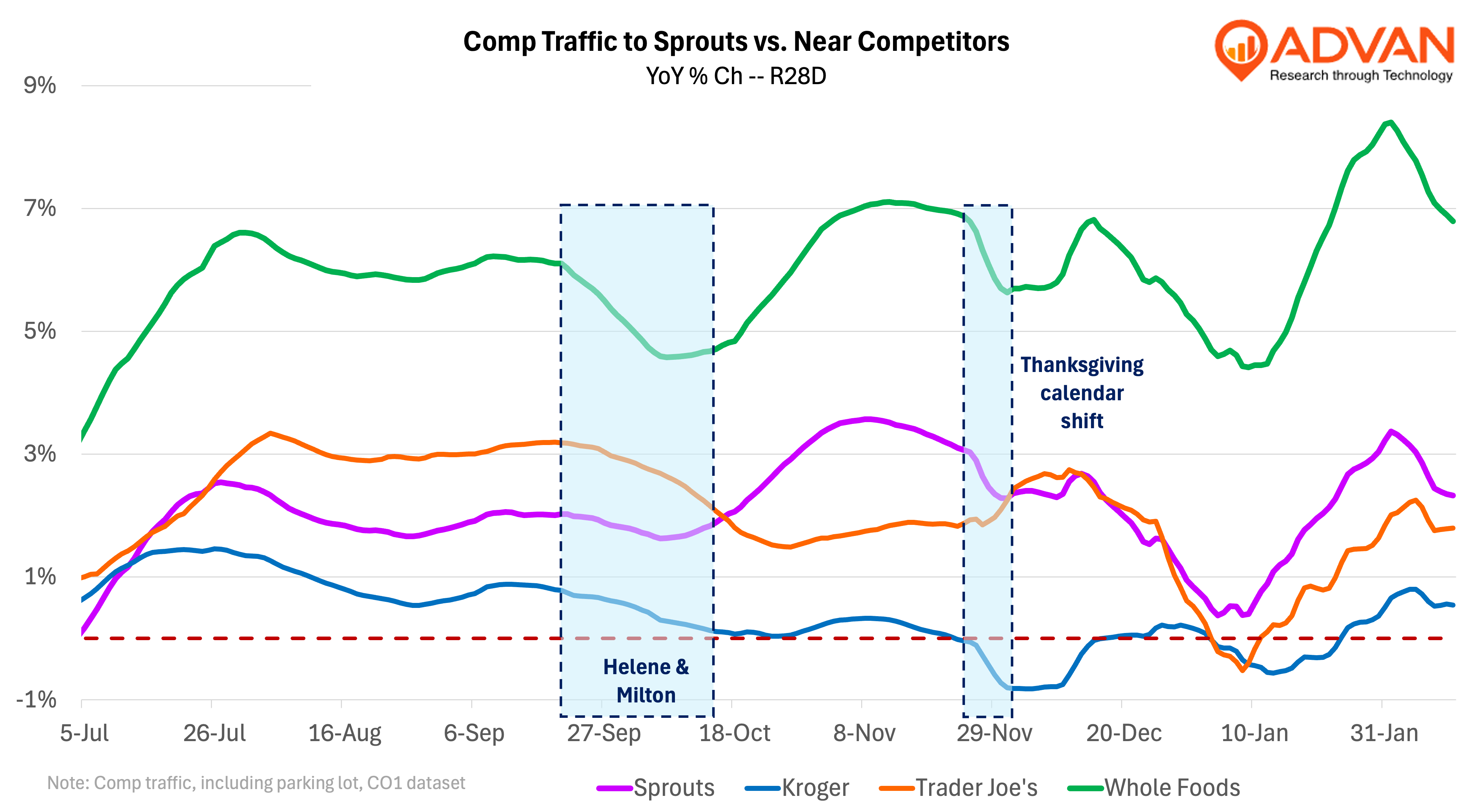 Sprouts reported Q4 results showed sales up +18%, comp-sales up +11.5%, and gross margin up +160 bps. The sales increase was well ahead of Advan’s +15.4% estimate (+/- 130 bps T4Q Moe, 96% T8Q correlation) although Advan’s estimate did correctly forecast a beat vs consensus*. E-commerce grew at a much stronger +37% rate, which added 300bps to the comp growth; additionally, a larger basket size contributed to comp-growth. Those two led to the outperformance versus our estimate. (E-commerce is being stimulated by the added Uber Eats, which has yet to anniversary.) Guidance for Q1 was a +10-11% comp-sales increase, or an implied +15% sales increase (when considering store expansion and the calendar), also ahead of Advan’s +13.7% current estimate; we believe the same two drivers are again behind the stronger rate. (One can find our earnings preview and view of the industry that we wrote about last week here.)