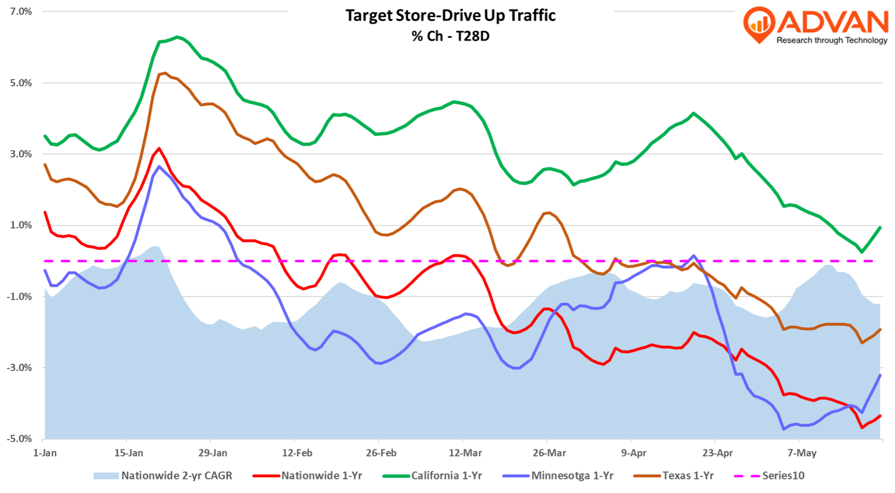 As the chart below demonstrates, nationwide traffic is currently -120bps below April’s rate. Moreover, some of Target’s largest markets have also mimicked the nationwide 1-year slump. As such, it wasn’t surprising that management lowered its outlook for the year. Cornell said, “In planning for the remainder of the year, we believe it's prudent to expect that current top-line pressures will continue in the near term.”