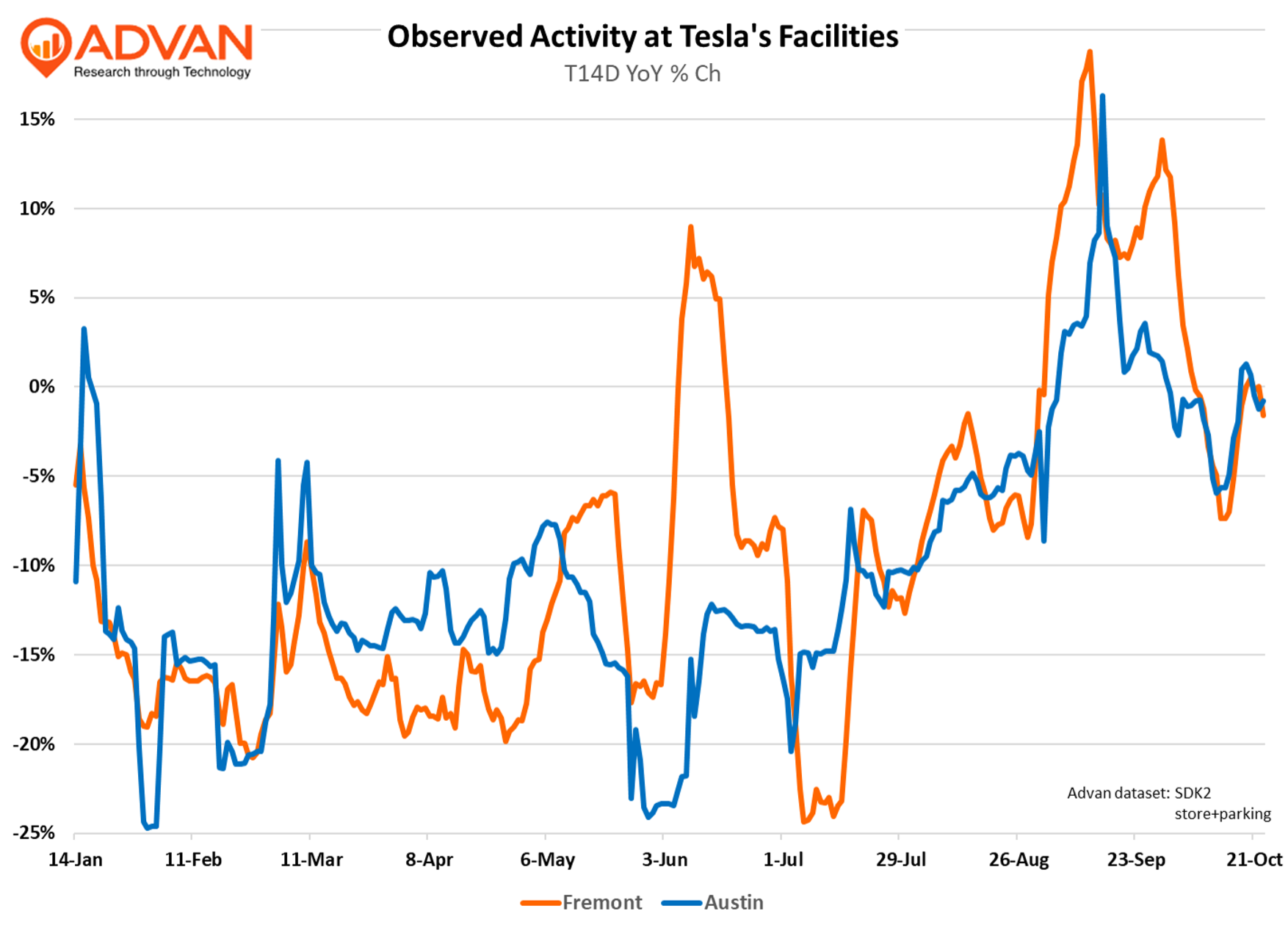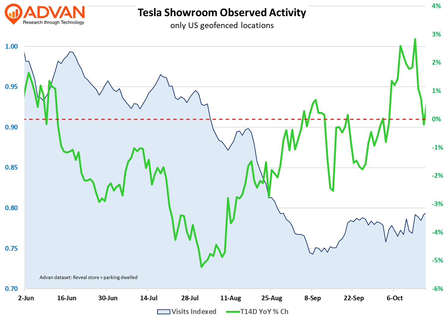 Our read of the above is that demand for Tesla vehicles in the US is stronger than expected and stronger than for non-Tesla EVs, with the “driver” being that Tesla makes highly desirable vehicles (not commenting on the Cyber) and a broadening of interest in FSD and the Tesla ecosystem. As evidence for this viewpoint, interest in Tesla FSD, as measured by Google searches by California residents, is up nearly 3-times from last year’s level. Further evidence is shown in the second chart, with showroom visitation remaining largely stable in late September and October, i.e. no observable air pocket following the expiration of the $7500. Finally, the third figure shows that activity has also largely been stable at the Fremont and Austin plants following the late September surge. Net-net, all signs suggest another good October and Q4 for Tesla vehicle sales in the US.