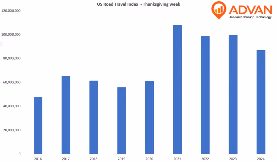 Earlier this week we examined how air travel fared during Thanksgiving 2024 (short answer: flat for the last 4 years): https://advanresearch.com/air-travel-steady-during-thanksgiving