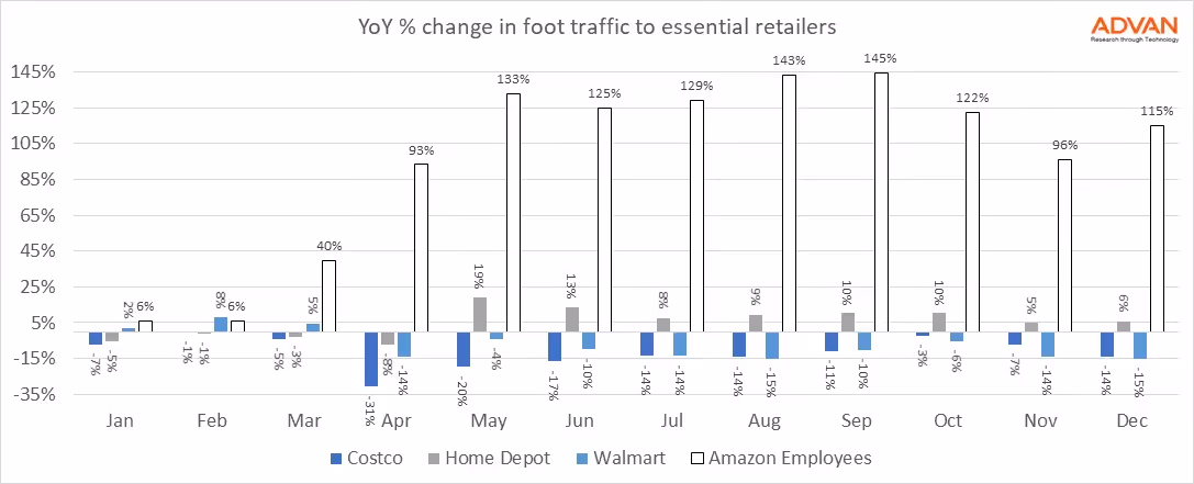 From the very start of the pandemic as we all stocked up on canned goods and toilet paper, and much of the country went into lock-down, foot traffic data clearly showed that big box retailers would be early winners. Despite restricting the number of customers in stores - and the now familiar image of 6ft-spaced line-ups outside - visitor numbers to Walmart and Costco barely fell year-over-year. At its lowest, Costco foot traffic was down 31%. More surprising perhaps was the performance of home improvement retailers like Home Depot which, from May onwards, saw an increase in foot traffic compared to last year. But the clear winner was Amazon. As more shopping moved online, the number of employees at Amazon warehouses went through the roof - as did the company’s revenues, which were up 37% in the third quarter of 2020.