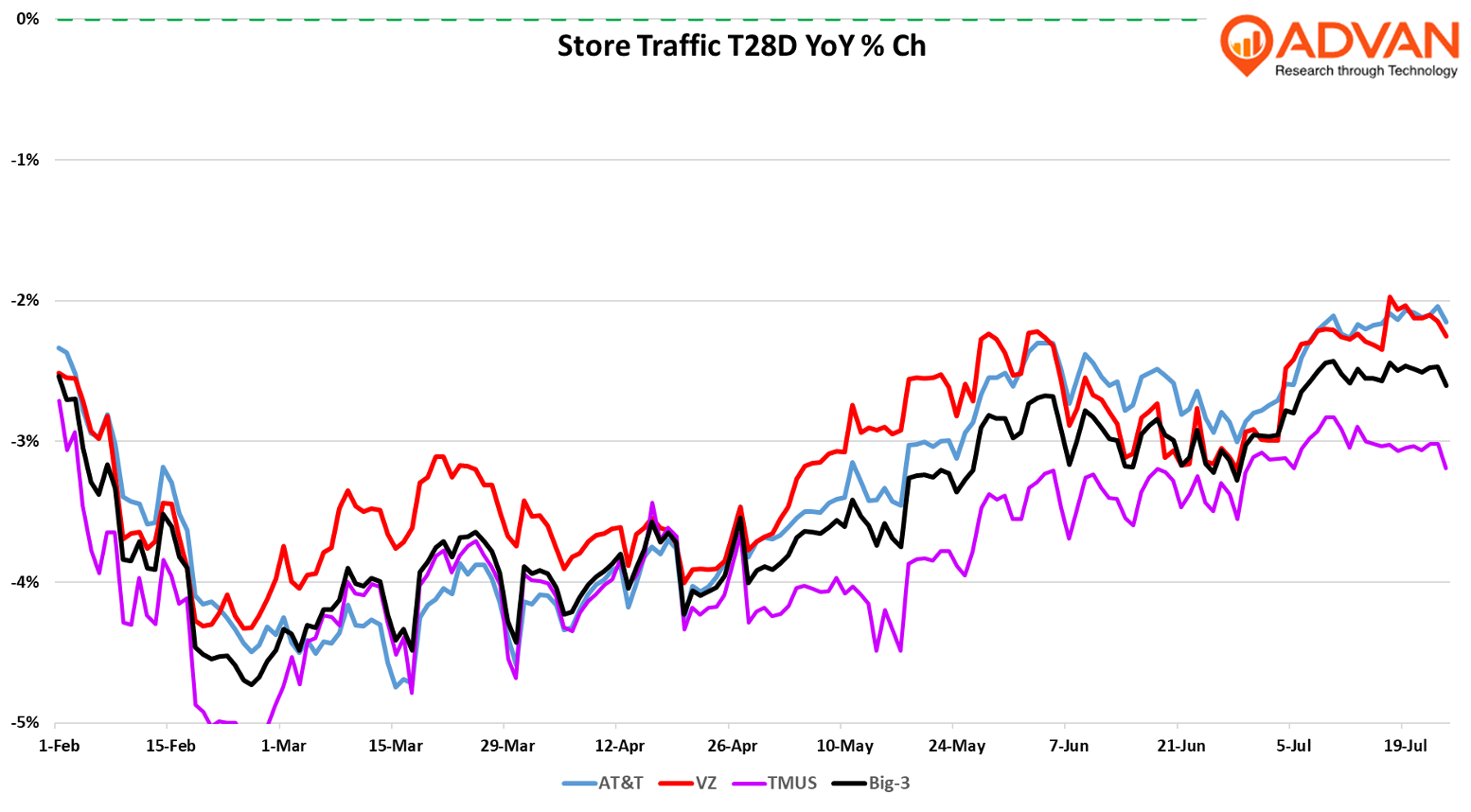 In describing Verizon's stronger consumer gross additions, CFO Tony Skiadas said, “On the gross adds, a couple of things here. The strength came from two places. First, we had very strong sales execution in our stores and distribution. … And then secondly, the value proposition when you think about -- we launched the best value guarantee back at the beginning of April, and that is resonating with customers in the market. (See the jump in foot traffic.) ...And what we said many times is volumes are important, and we'll pulse in and pulse out but where it makes financial sense.” AT&T’s CFO said, “We delivered 401,000 postpaid phone net adds in the second quarter. This subscriber growth was ahead of our own expectations, driven by postpaid phone gross adds that increased more than 20% versus last year.” As shown in the chart above, AT&T traffic trends closely match Verizon’s.