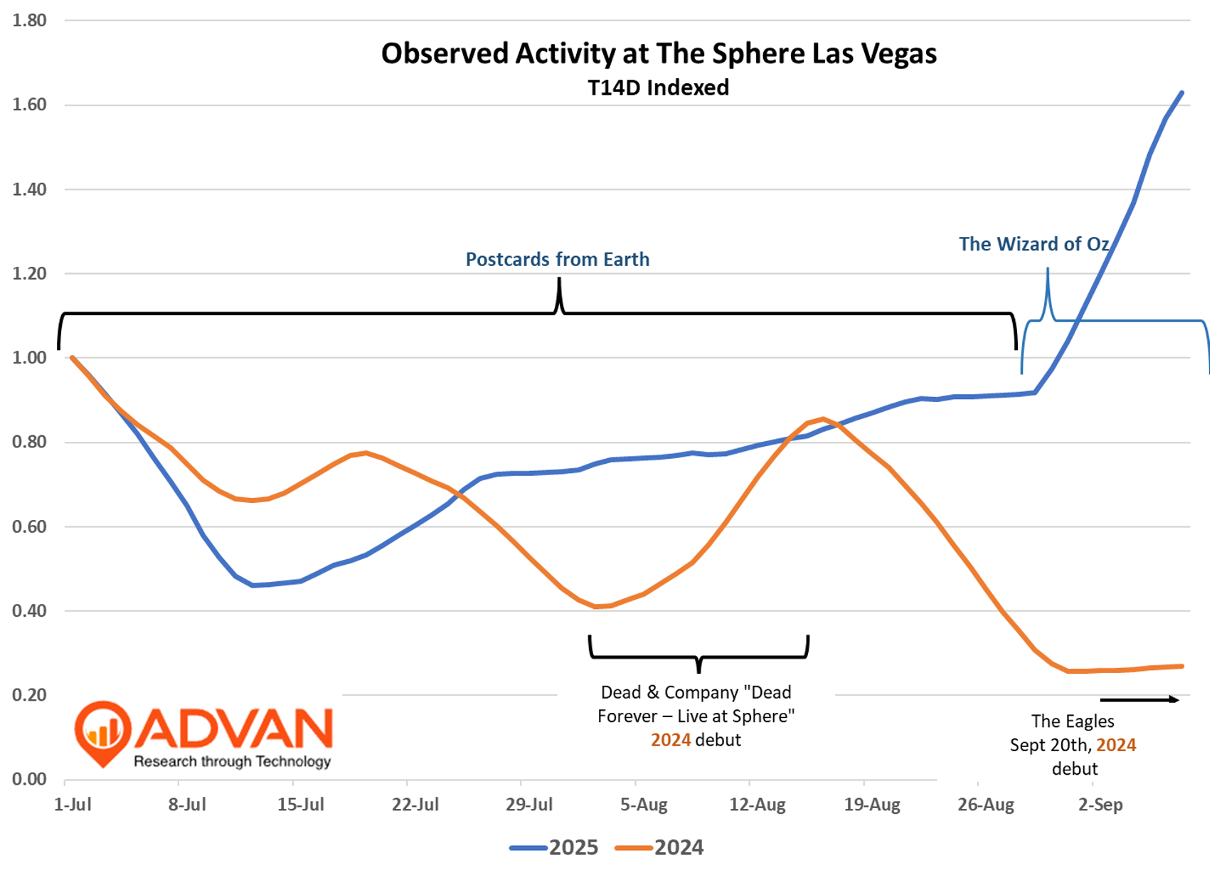 A retooled Wizard of Oz at Sphere in Las Vegas did around $9.3M in box office receipts for the last Thursday – Sunday period; it’s second weekend. We base the estimate on observed visits of 46K for the four-day period and a seat price of $200 per showing. There are two showings Monday – Thursday and four on Saturday and Sunday. This second weekend benefited from all of the positive buzz after the opening weekend. Next weekend will be an important tell on what the ultimate becomes. One can find a description of the production here.