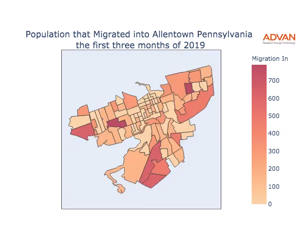The map below shows the migration into Allentown, PA by Census Block Group (CBG).