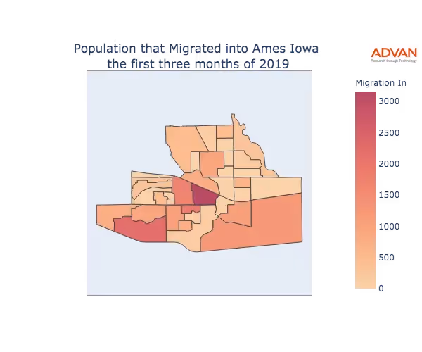 The map below shows the migration into Ames, IA by Census Block Group (CBG).