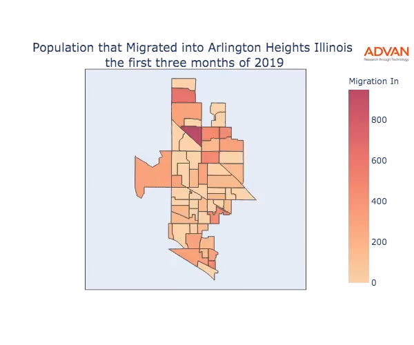 The map below shows the migration into Arlington Heights, IL by Census Block Group (CBG).