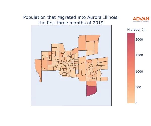 The map below shows the migration into Aurora, IL by Census Block Group (CBG).