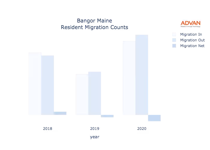 The charts below graph the inbound, outbound and net migration to the city of Bangor, ME for each year of data available. Data displayed on the charts is annually aggregated; the REPerspectives product allows analysis of mobility trends with monthly granularity by State, Zip, County and Census Block Group.