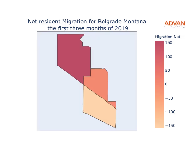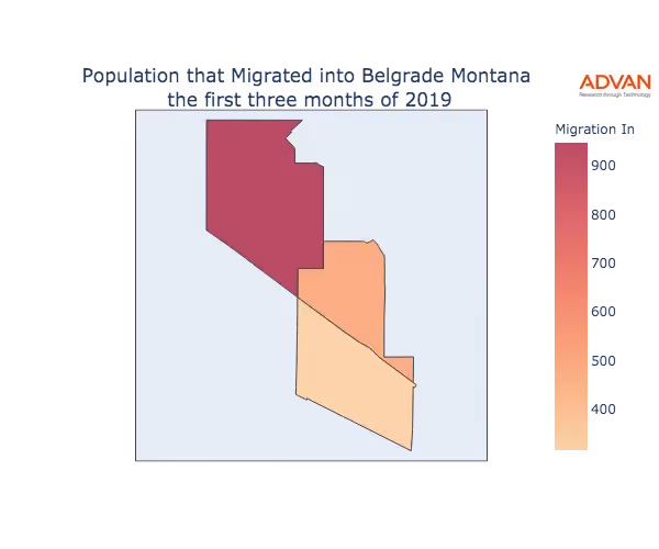 The map below shows the migration into Belgrade, MT by Census Block Group (CBG).
