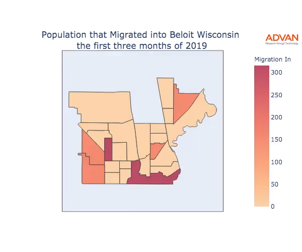 The map below shows the migration into Beloit, WI by Census Block Group (CBG).