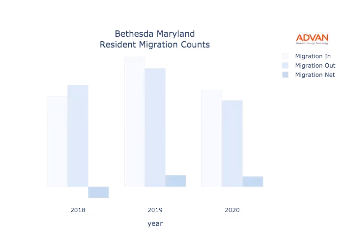 The charts below graph the inbound, outbound and net migration to the city of Bethesda, MD for each year of data available. Data displayed on the charts is annually aggregated; the REPerspectives product allows analysis of mobility trends with monthly granularity by State, Zip, County and Census Block Group.