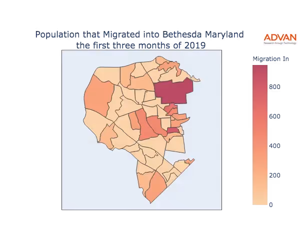 The map below shows the migration into Bethesda, MD by Census Block Group (CBG).