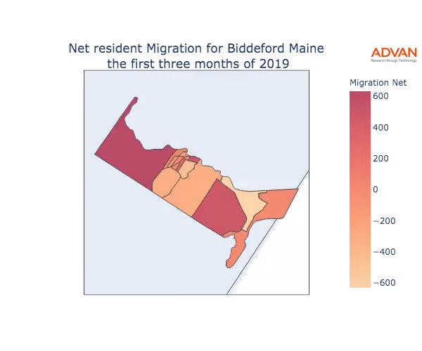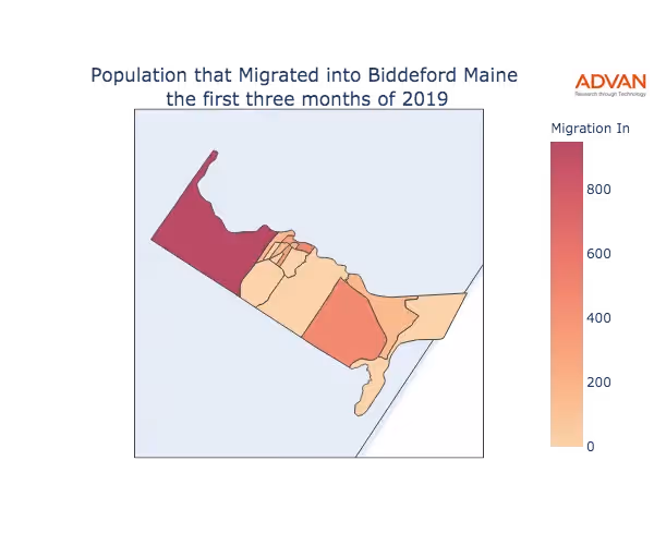 The map below shows the migration into Biddeford, ME by Census Block Group (CBG).