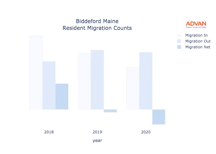 The charts below graph the inbound, outbound and net migration to the city of Biddeford, ME for each year of data available. Data displayed on the charts is annually aggregated; the REPerspectives product allows analysis of mobility trends with monthly granularity by State, Zip, County and Census Block Group.