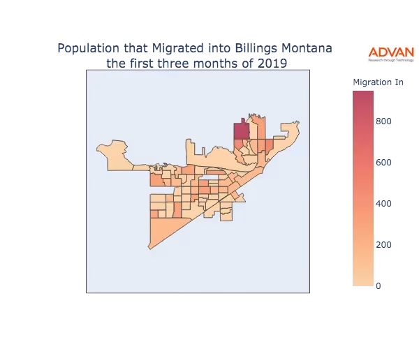 The map below shows the migration into Billings, MT by Census Block Group (CBG).