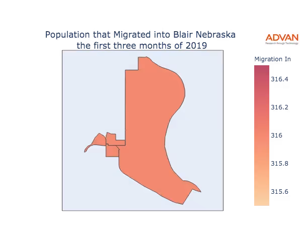 The map below shows the migration into Blair, NE by Census Block Group (CBG).
