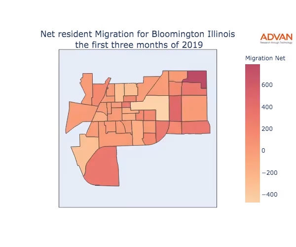 The map below shows the migration into Bloomington, IL by Census Block Group (CBG).