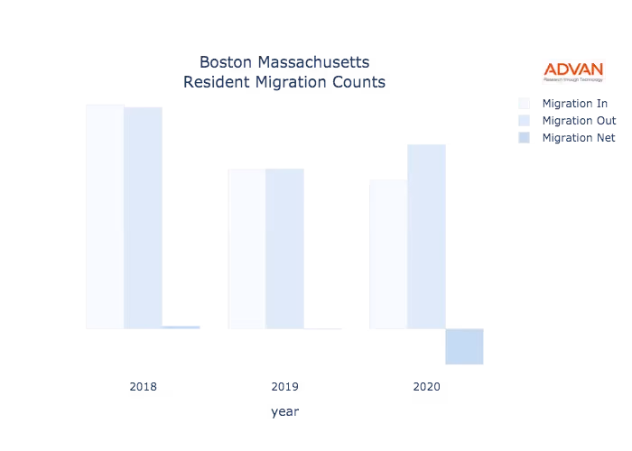 The charts below graph the inbound, outbound and net migration to the city of Boston, MA for each year of data available. Data displayed on the charts is annually aggregated; the REPerspectives product allows analysis of mobility trends with monthly granularity by State, Zip, County and Census Block Group.