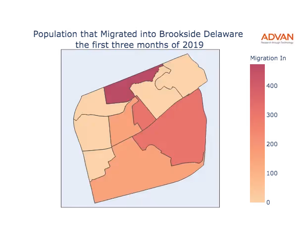 The map below shows the migration into Brookside, DE by Census Block Group (CBG).