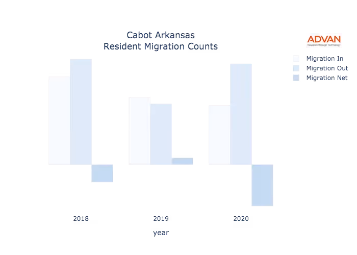 The charts below graph the inbound, outbound and net migration to the city of Cabot, AR for each year of data available. Data displayed on the charts is annually aggregated; the REPerspectives product allows analysis of mobility trends with monthly granularity by State, Zip, County and Census Block Group.