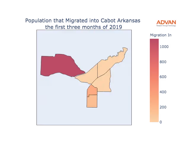 The map below shows the migration into Cabot, AR by Census Block Group (CBG).