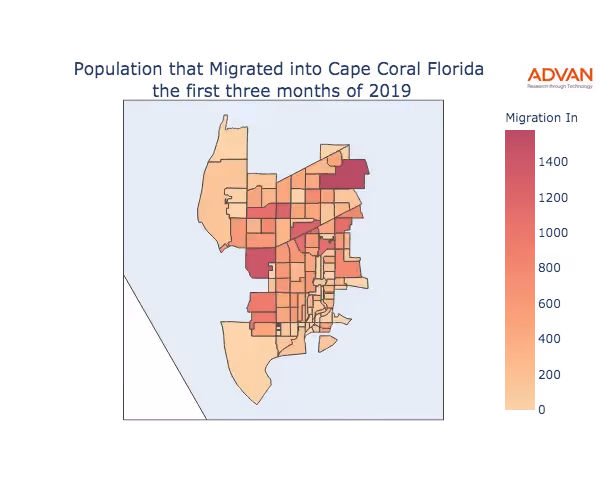 The map below shows the migration into Cape Coral, FL by Census Block Group (CBG).
