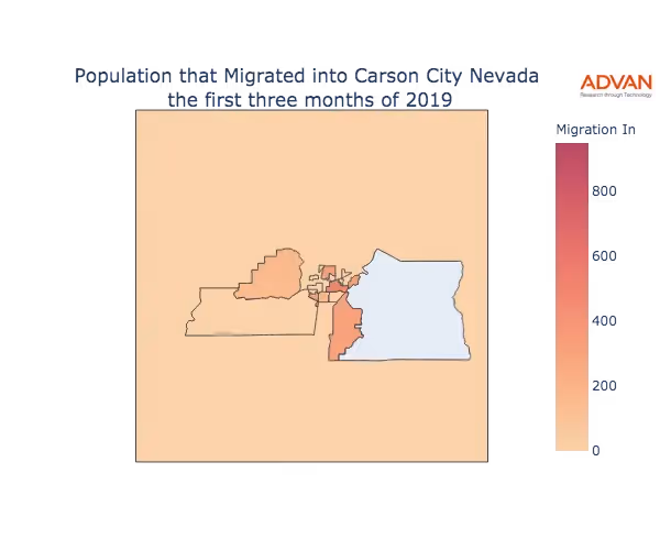 The map below shows the migration into Carson City, NV by Census Block Group (CBG).