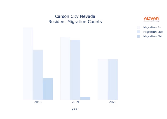 The charts below graph the inbound, outbound and net migration to the city of Carson City, NV for each year of data available. Data displayed on the charts is annually aggregated; the REPerspectives product allows analysis of mobility trends with monthly granularity by State, Zip, County and Census Block Group.