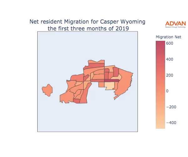 The map below shows the migration into Casper, WY by Census Block Group (CBG).
