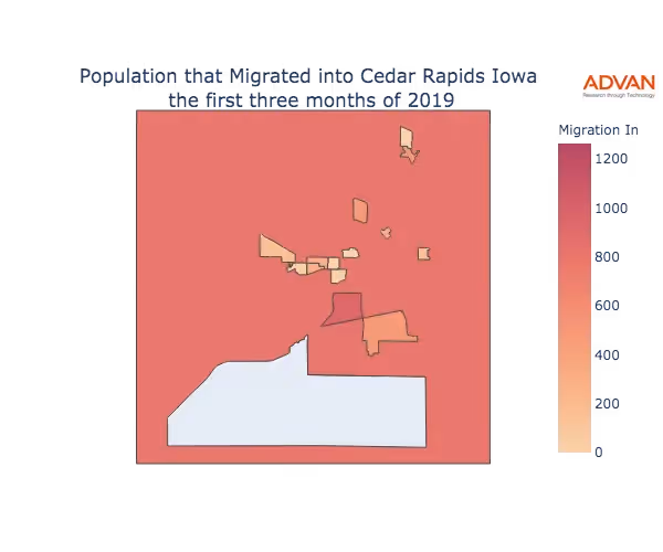 The map below shows the migration into Cedar Rapids, IA by Census Block Group (CBG).