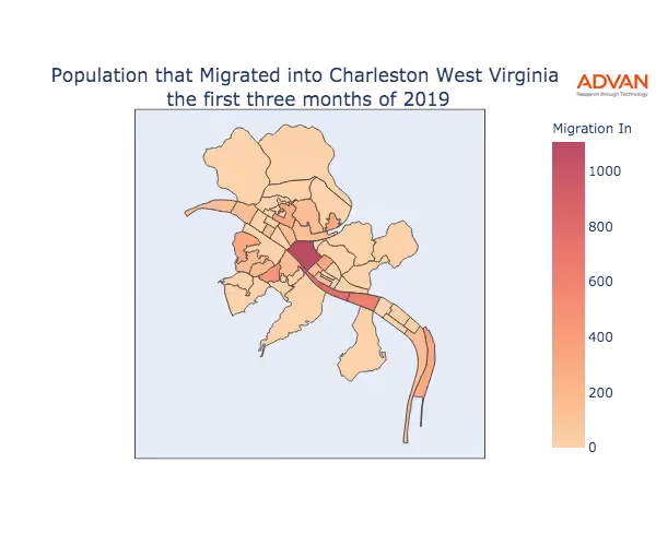 The map below shows the migration into Charleston, WV by Census Block Group (CBG).