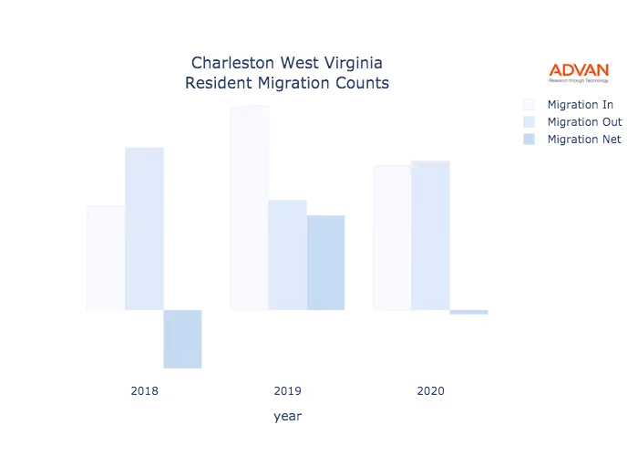 The charts below graph the inbound, outbound and net migration to the city of Charleston, WV for each year of data available. Data displayed on the charts is annually aggregated; the REPerspectives product allows analysis of mobility trends with monthly granularity by State, Zip, County and Census Block Group.