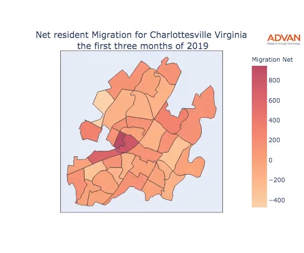 The map below shows the migration into Charlottesville, VA by Census Block Group (CBG).