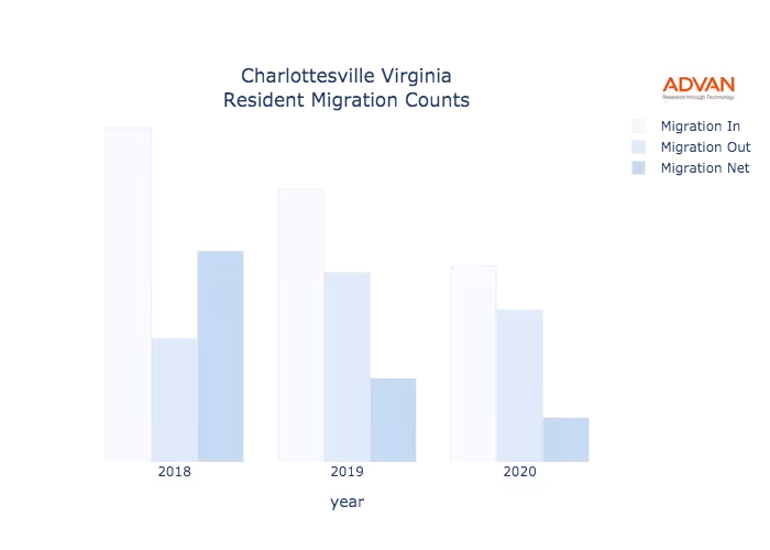 The charts below graph the inbound, outbound and net migration to the city of Charlottesville, VA for each year of data available. Data displayed on the charts is annually aggregated; the REPerspectives product allows analysis of mobility trends with monthly granularity by State, Zip, County and Census Block Group.