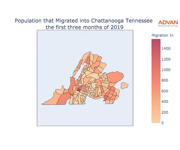 The map below shows the migration into Chattanooga, TN by Census Block Group (CBG).