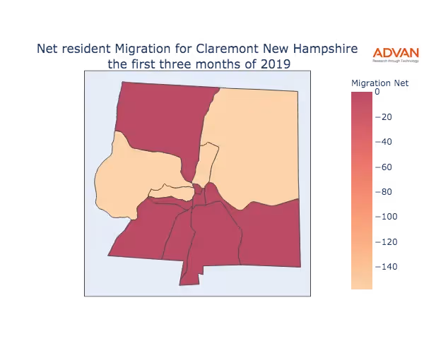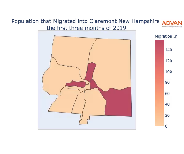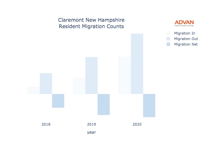 The charts below graph the inbound, outbound and net migration to the city of Claremont, NH for each year of data available. Data displayed on the charts is annually aggregated; the REPerspectives product allows analysis of mobility trends with monthly granularity by State, Zip, County and Census Block Group.