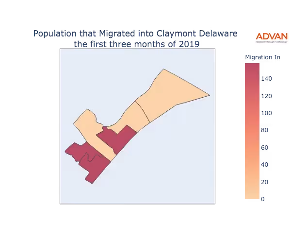 The map below shows the migration into Claymont, DE by Census Block Group (CBG).