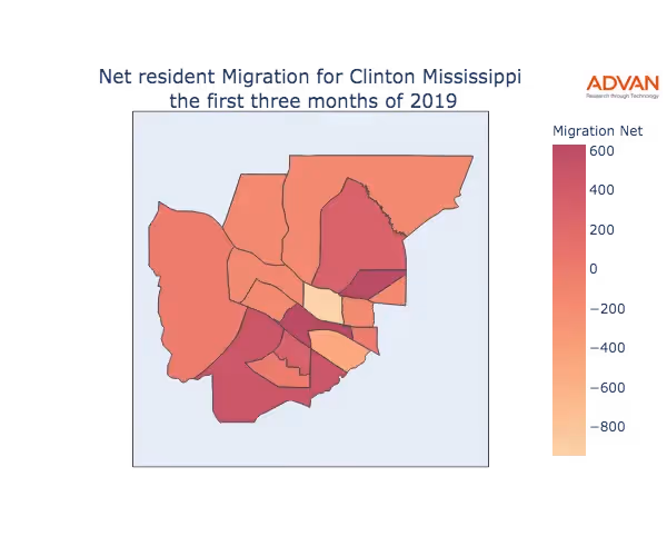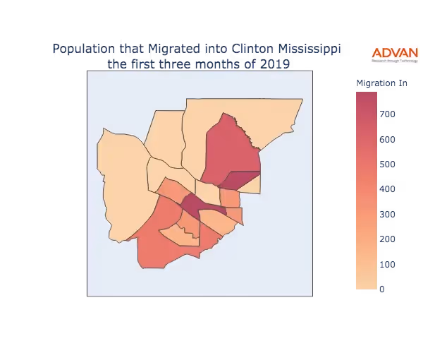 The map below shows the migration into Clinton, MS by Census Block Group (CBG).