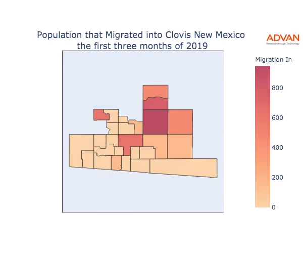 The map below shows the migration into Clovis, NM by Census Block Group (CBG).