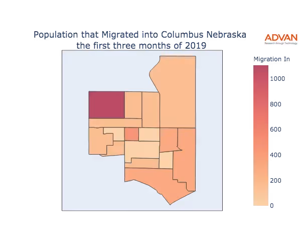 The map below shows the migration into Columbus, NE by Census Block Group (CBG).