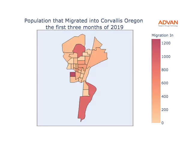 The map below shows the migration into Corvallis, OR by Census Block Group (CBG).