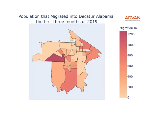 The map below shows the migration into Decatur, AL by Census Block Group (CBG).