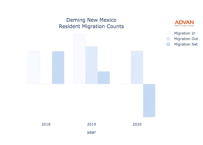 The charts below graph the inbound, outbound and net migration to the city of Deming, NM for each year of data available. Data displayed on the charts is annually aggregated; the REPerspectives product allows analysis of mobility trends with monthly granularity by State, Zip, County and Census Block Group.