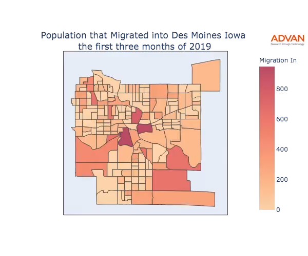 The map below shows the migration into Des Moines, IA by Census Block Group (CBG).