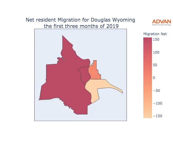The map below shows the migration into Douglas, WY by Census Block Group (CBG).