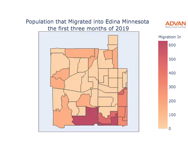 The map below shows the migration into Edina, MN by Census Block Group (CBG).