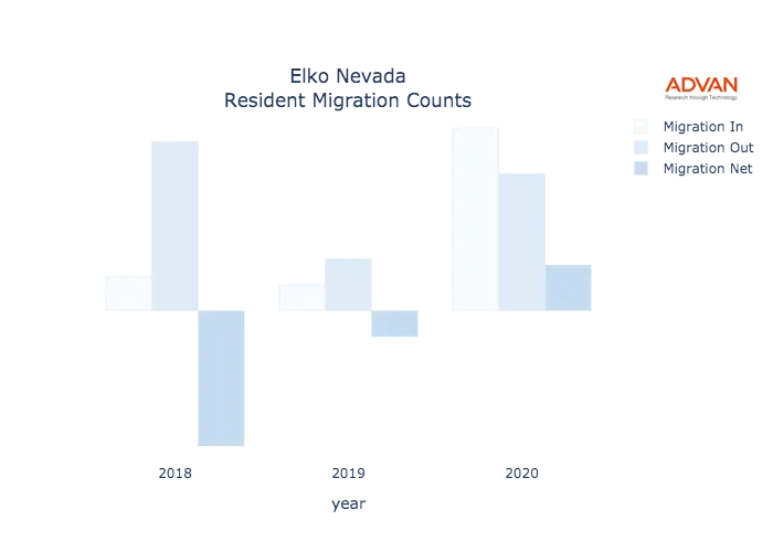 The charts below graph the inbound, outbound and net migration to the city of Elko, NV for each year of data available. Data displayed on the charts is annually aggregated; the REPerspectives product allows analysis of mobility trends with monthly granularity by State, Zip, County and Census Block Group.